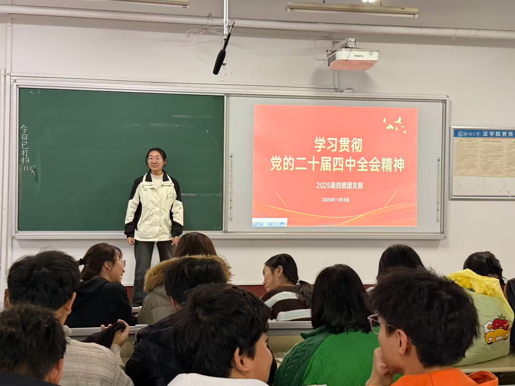 会上,各团支部书记通过图文演示、视频讲解等形式带领在场同学研读会议公报,重点解读全会提出的重大理论观点、重要战略思想与重大决策部署。围绕党的二十届四中全会通过的《中共中央关于制定国民经济和社会发展第十五个五年规划的建议》部署的推进社会主义民主法治建设的重大任务,结合法学专业特点,阐释推进法治中国建设的战略意义和实践路径,帮助在场同学深刻理解党的二十届四中全会精神与自身专业学习的紧密联系。鼓励同学们自觉把个人理想追求融入法治中国建设的宏伟蓝图,努力成长为德才兼备、德法兼修的高素质法治人才。同学们纷纷表示,要将党的二十届四中全会精神内化于心、外化于行,以扎实的专业学习和积极的法治实践,在法治轨道上为全面建设社会主义现代化国家注入青春动能。
